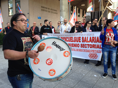 Una treintena de vigilantes de seguridad de la empresa Alcor se concentraron hoy ante los juzgados para protestar porque el dueño se descolgó unilateralmente del convenio nacional y les rebajó el salario en 300 euros a cada empleado con un convenio propio un 30 por ciento inferior al estatal. El que más cobra gana 1.000 euros, dicen. Alcor presta servicio de vigilancia en los juzgados de Vigo y Tui, y en la Cidade da Cultura, en Santiago de Compostela. Un portavoz de FES-UGT de Vigo, Chus Álvarez, dijo que la rebaja de costes salariales hace más competitiva la empresa de forma que logra contratos públicos y pidió a la Administración que controle estas prácticas. Temen que la tendencia sea que el sueldo caiga al mínimo ínterprofesional.