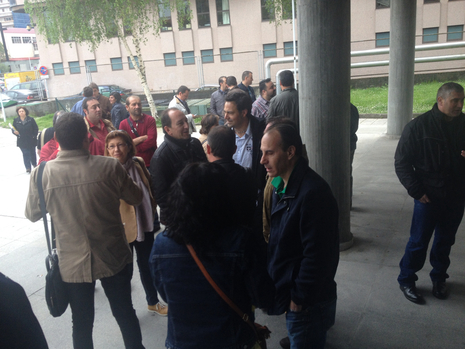 Una treintena de empleados esperaron en las puertas de juzgado porque la policía no les dejó pasar si no iban a declarar como testigos. Un representante de UGT dijo que este caso es comparable al de Serafín y Carlos, para los que se les ha pedido el indulto.